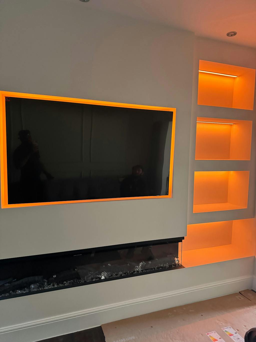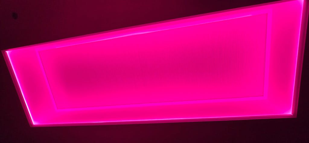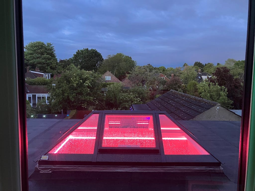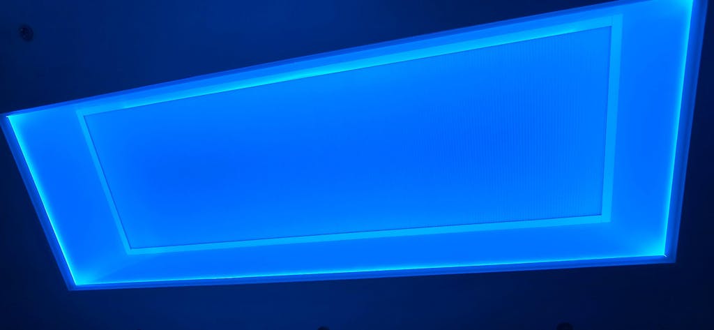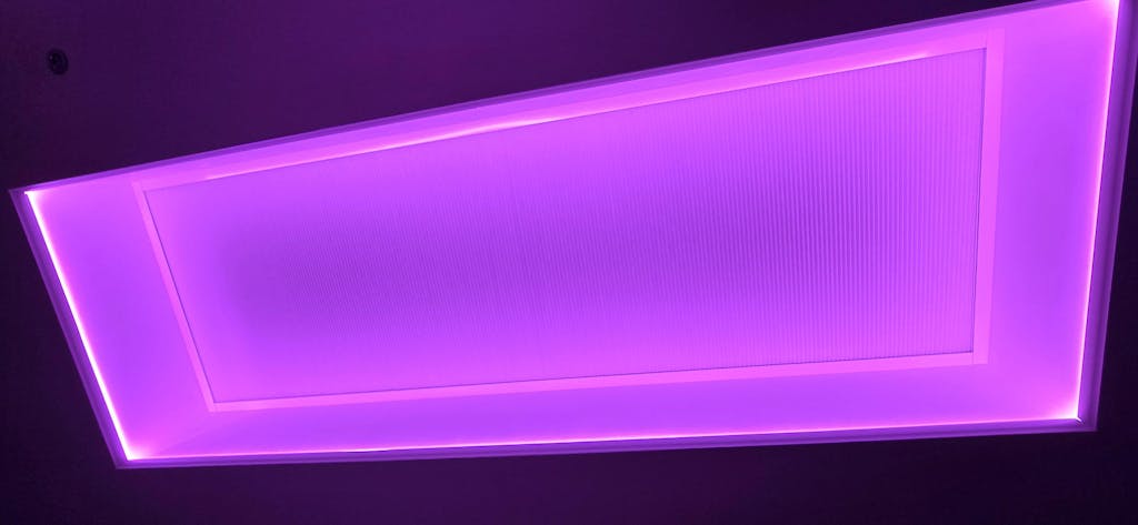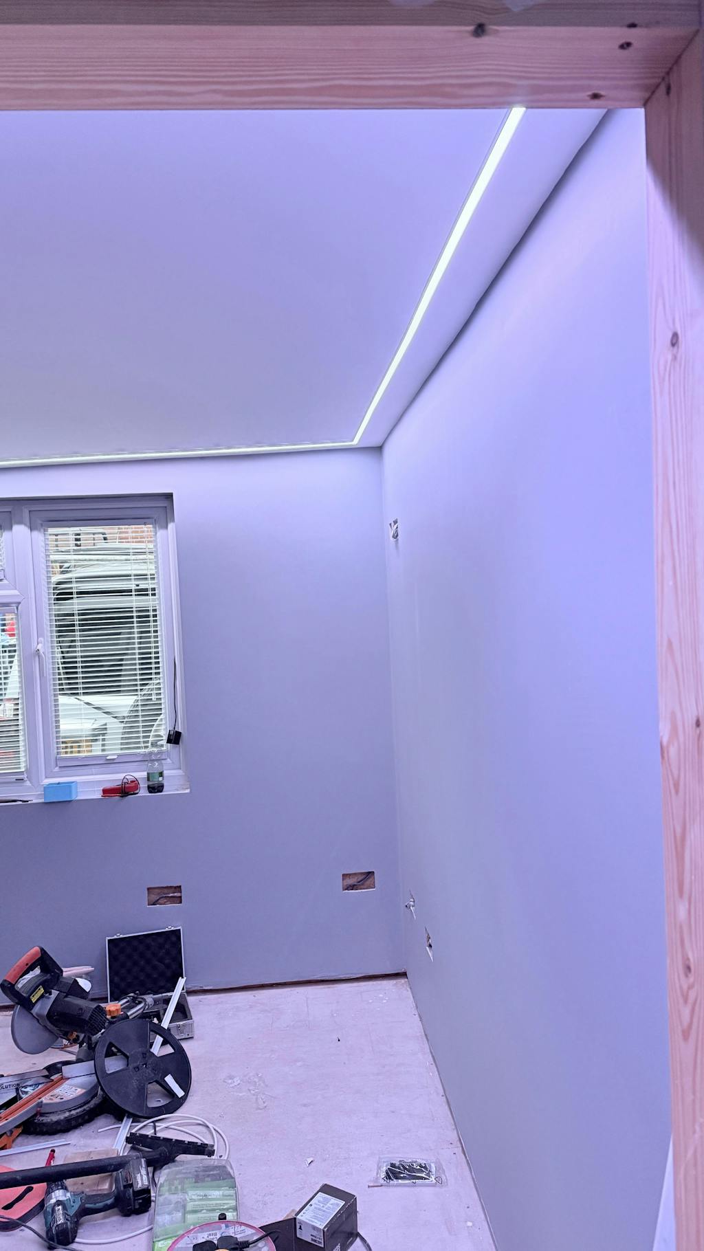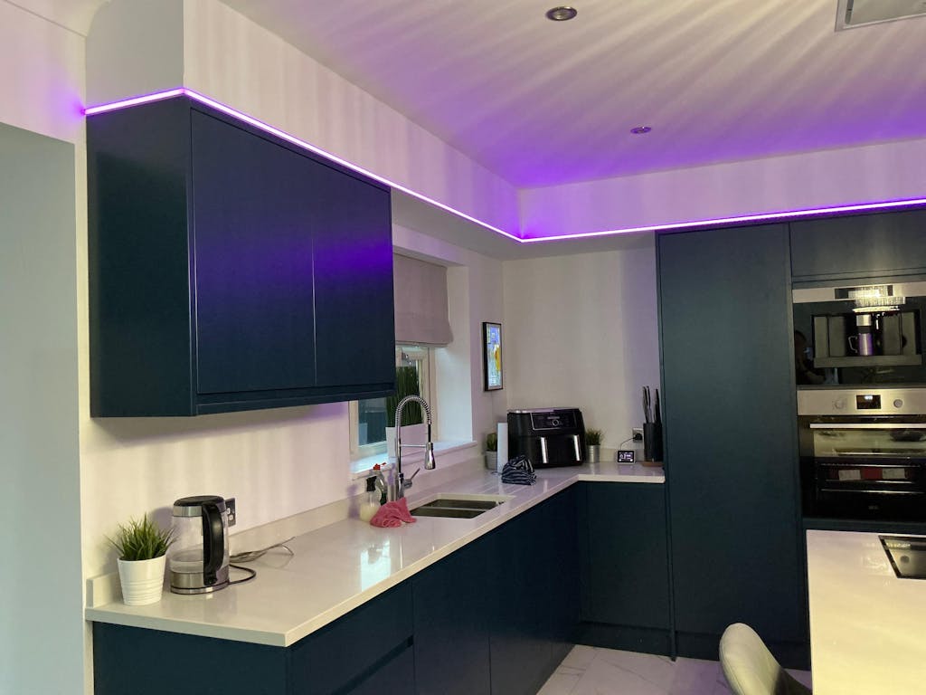 For a room 14 * 7m, this would mean using 6 * 7m pieces made to size in our factory, ready for you to fit. At 2 corners of the room you would need a mains power (240vAC) feed to go into a transformer at each location, capable of running 21m (50%) of the LED (it would actually be 1 * 150W and 1 * 240W at each of the two corners), with two control interfaces at each corner. All four interfaces would pair onto a single remote or join the same App-operation. The control then works wirelessly. All strips operate the same thing at the same time.