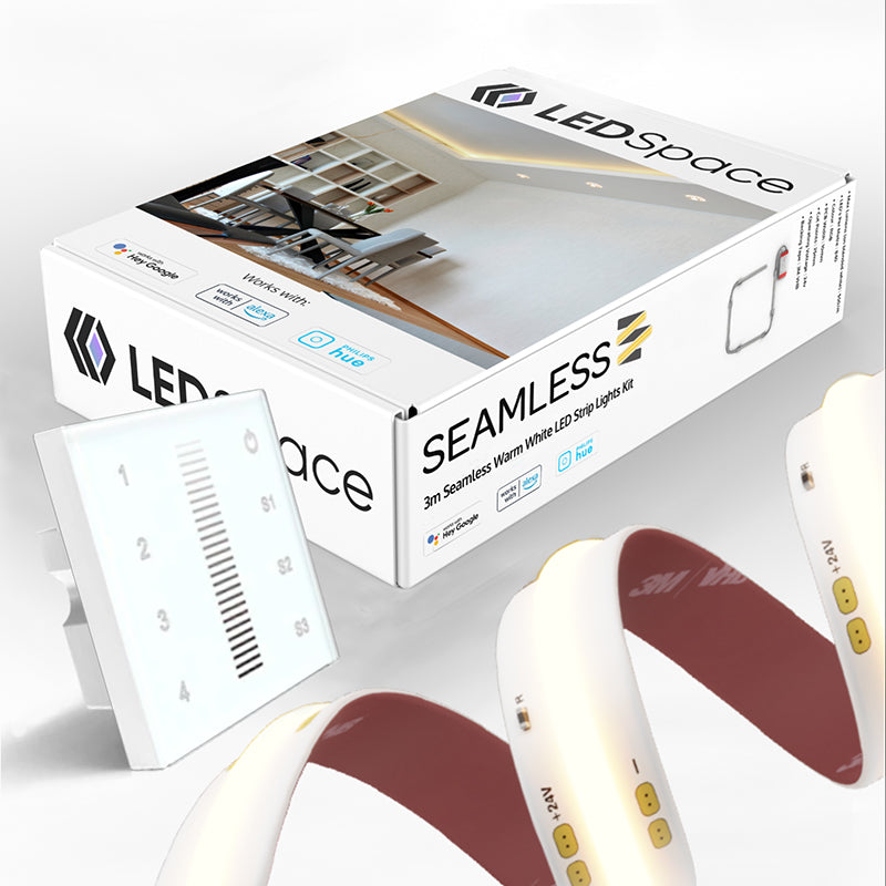 This ready-made LED lighting pack is perfect for DIY installation. It is supplied with 3 metres of our Seamless LED Strip, a 3-metre cable with 7 quick and easy, solder-free connectors to make power cables and corner connector cables, allowing you to easily and safely connect to the power supply and interface which are also included. The LED strip operates at just 24 volts, is safe to touch and consumes no more than 9 watts of electricity per metre.