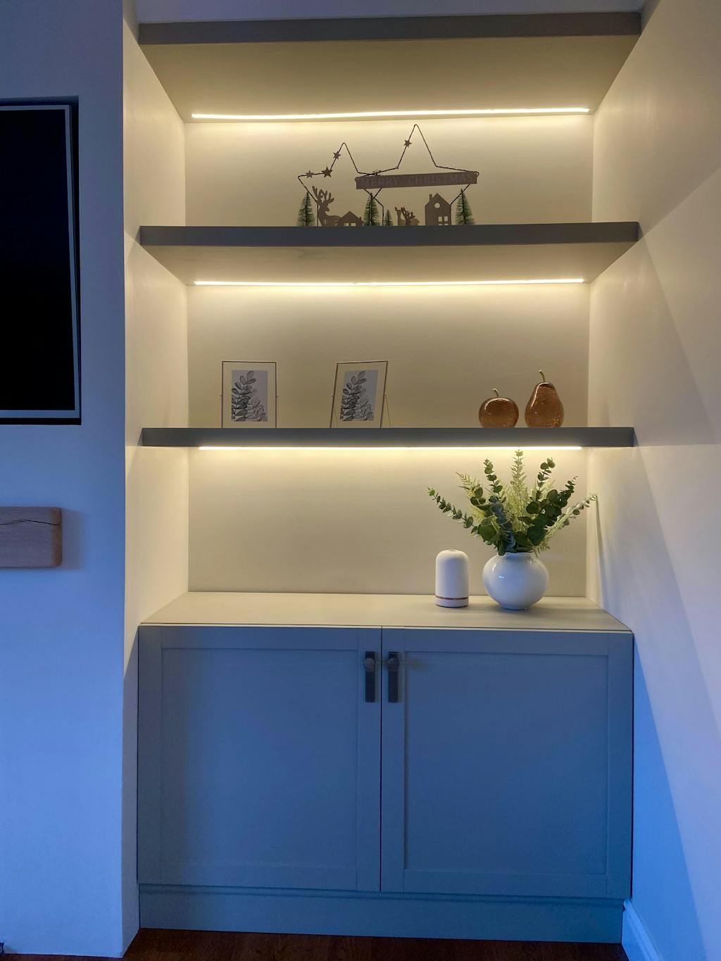 Hi, I am wanting to put these into my media wall, I am not sure what else I would need as there will be 6 shelves at 375mm wide. Could you please let me know if I can use this item and get some extra connectors and cable if needed, also could does this just plug into the wall socket. Can you please let me know what the total price would be. Regards Keith