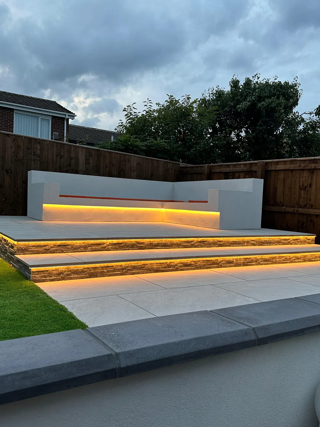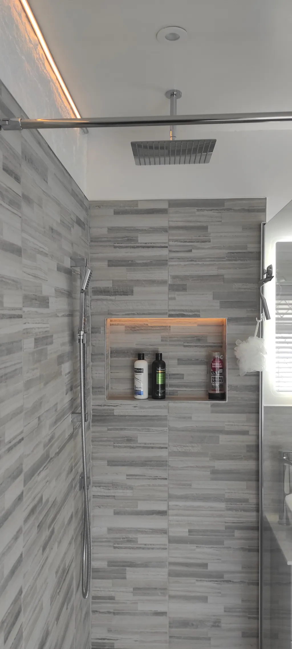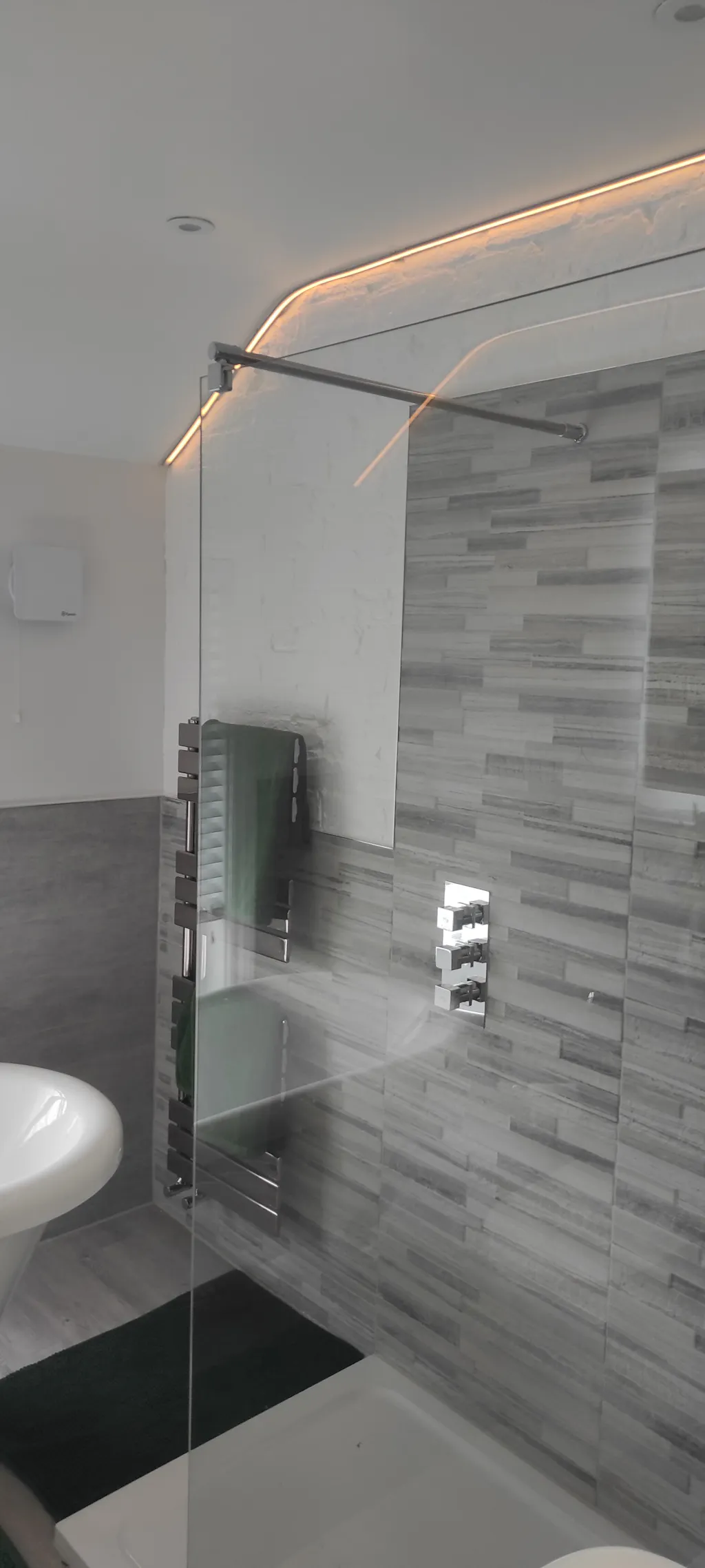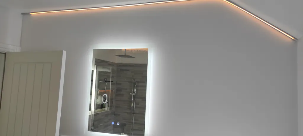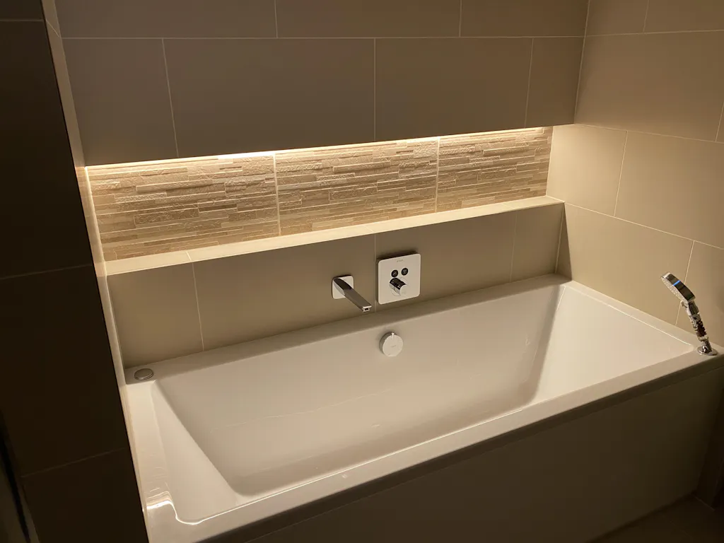 Very smart warm white dotless LED lighting highlights the recessed wall above the bath